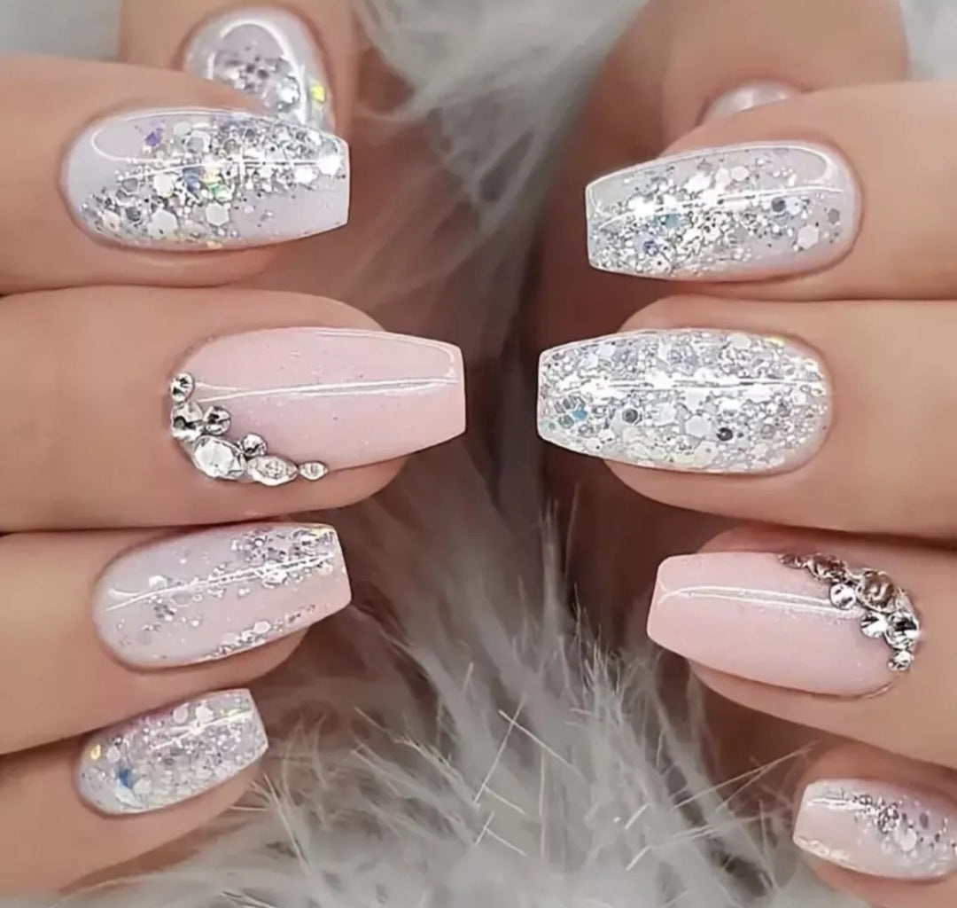 24pcs Glossy Medium Ballet Fake Nails, Pink & White With Silver Shiny Rhinestone