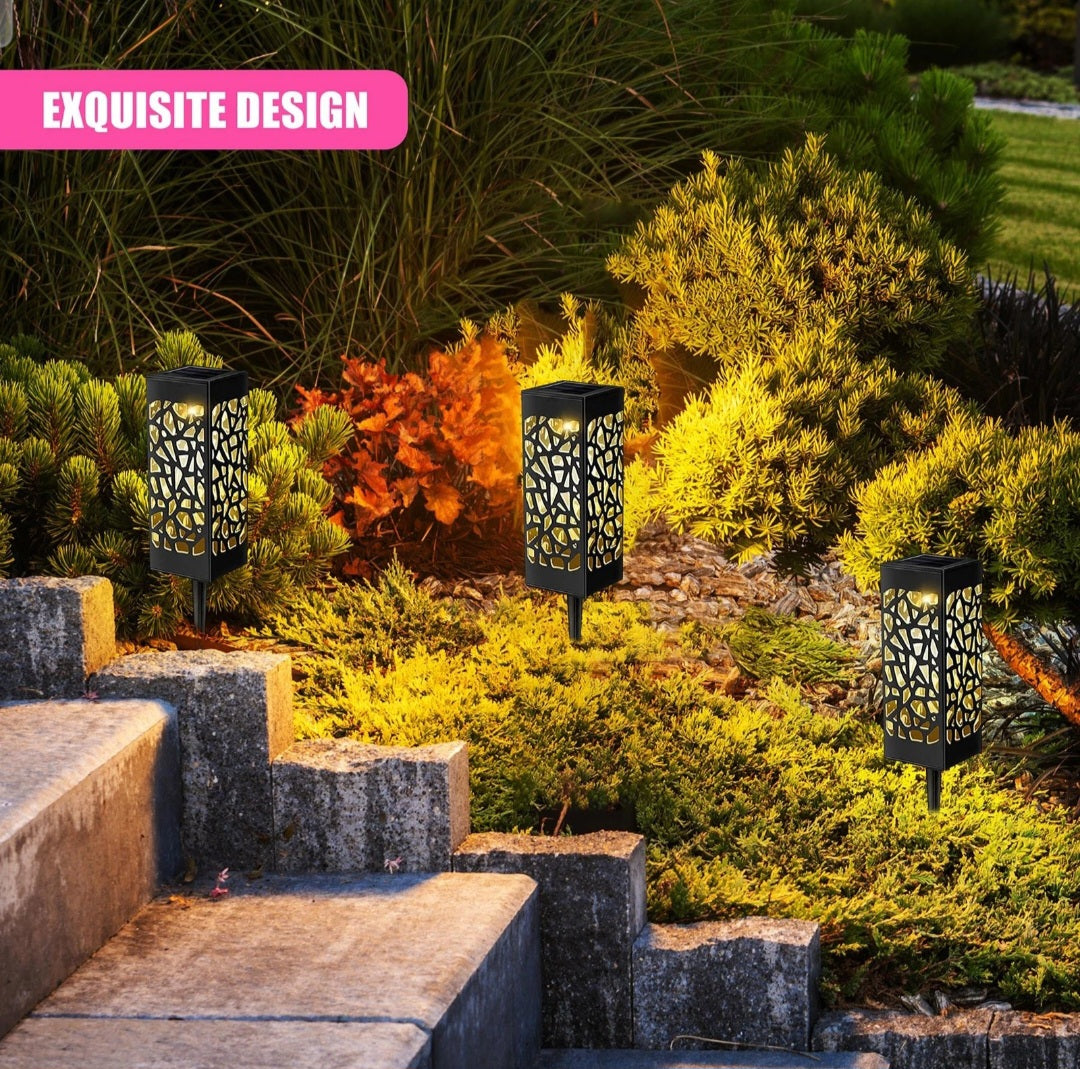 Elegant solar stake lights outdoor garden with intricate cut-out design. Emits a soft warm white glow, perfect for enhancing garden solar lights aesthetics.
