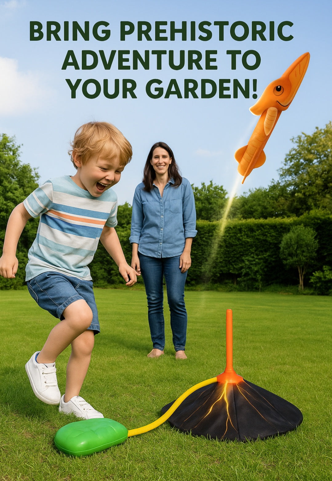 Unleash endless energy as kids jump and stomp to blast dinosaur rockets soaring up to 100 feet in the air. The easy-to-use volcano launcher and fossilised stomp pad make it simple for little feet to send T-Rex Triceratops and Pterodactyl rockets flying safely in gardens or parks.