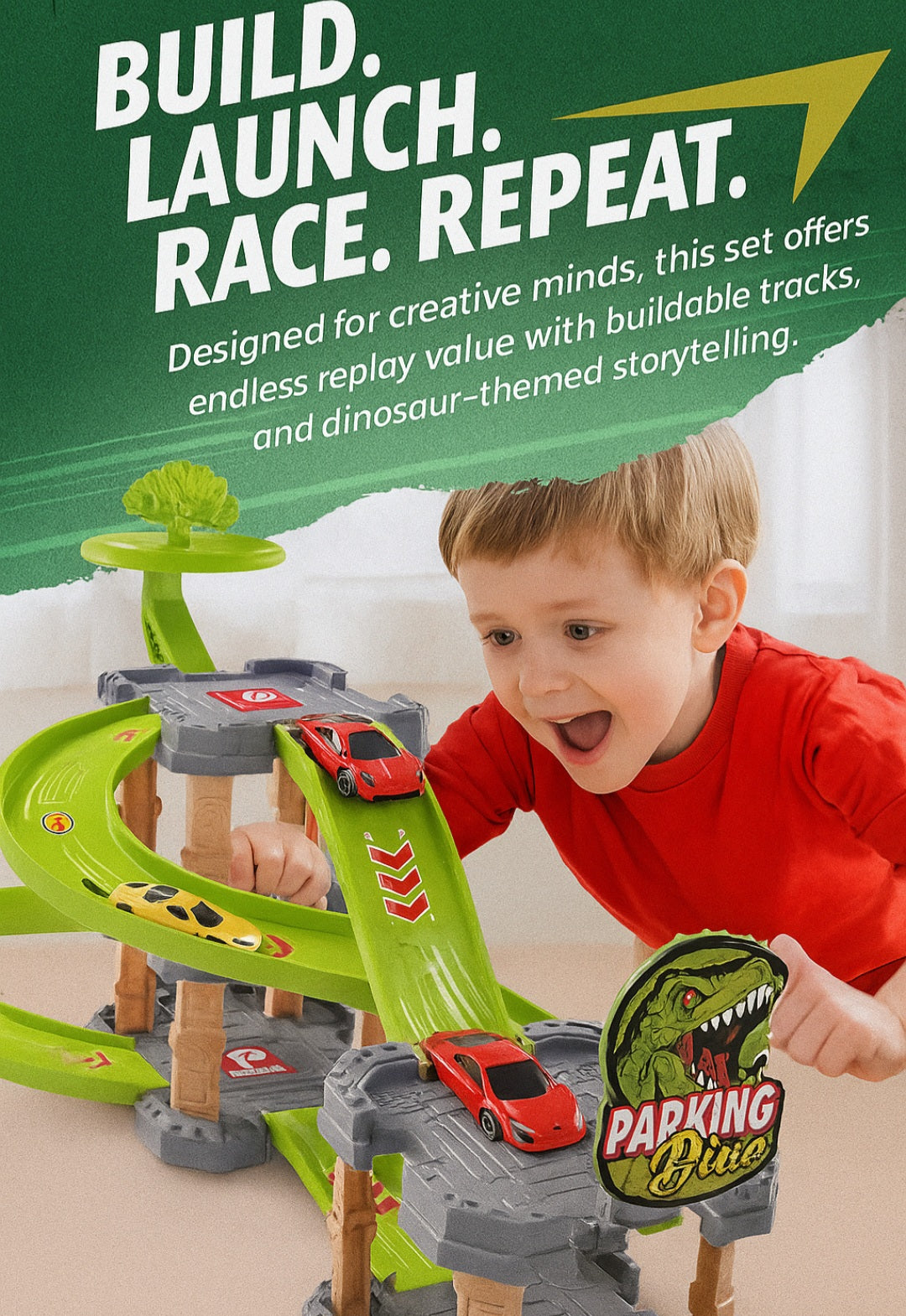 Includes a 3-tier car park design with thrilling tracks curves and a built-in dinosaur mouth launcher for high-speed action and fun racing. -