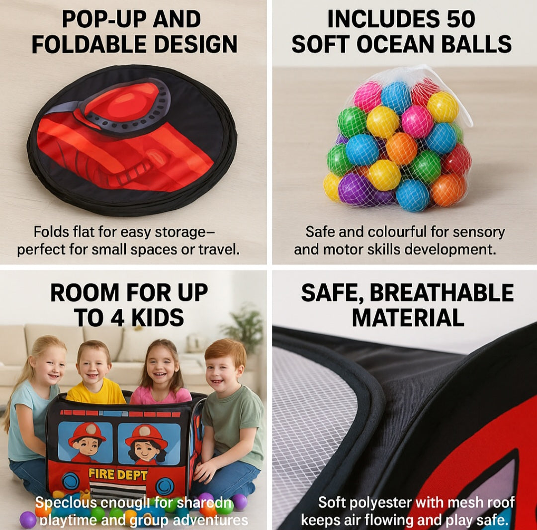This vibrant red fire engine play tent sparks kids imaginations as they pretend to be brave firefighters. The realistic printed details and drivers cab window make it perfect for immersive make-believe games.