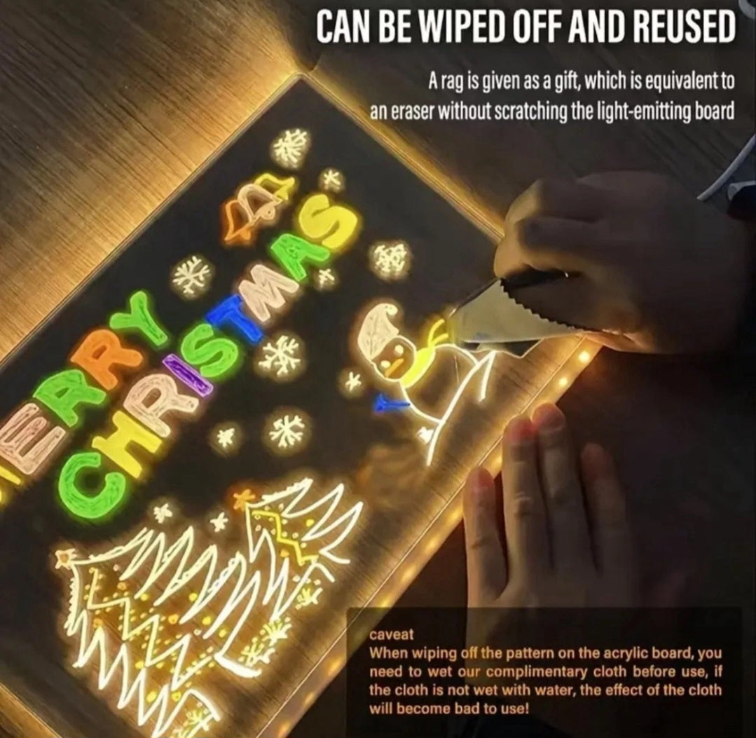 The LED Note Board with 7 Colour Pen in acrylic is a stylish and practical addition to any home décor. The rectangular-shaped board features an LED message board for easily displaying memos or messages. The Art Deco style and multicolor design add a fun and vibrant touch, perfect for children's drawing or leaving notes for the family. This 30*20cm size is both standing and portable, making it a versatile and eye-catching decorative accessory.