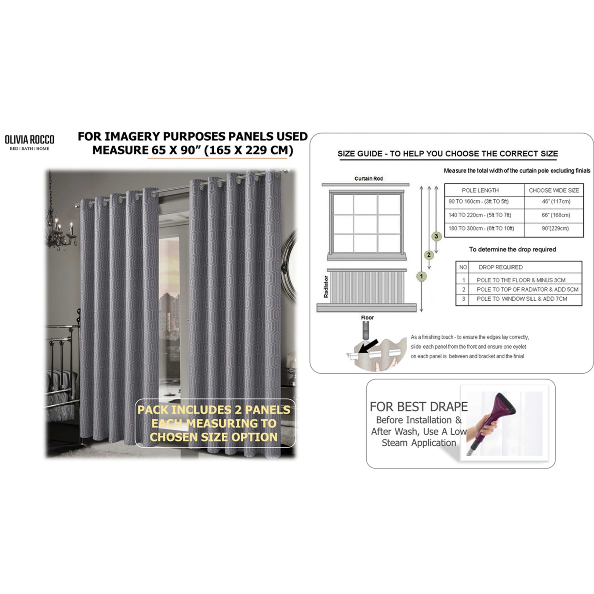 Description: Featuring sturdy metal eyelets, these curtains are designed for hassle-free installation. Simply slide them onto any standard curtain pole for a perfectly pleated look.