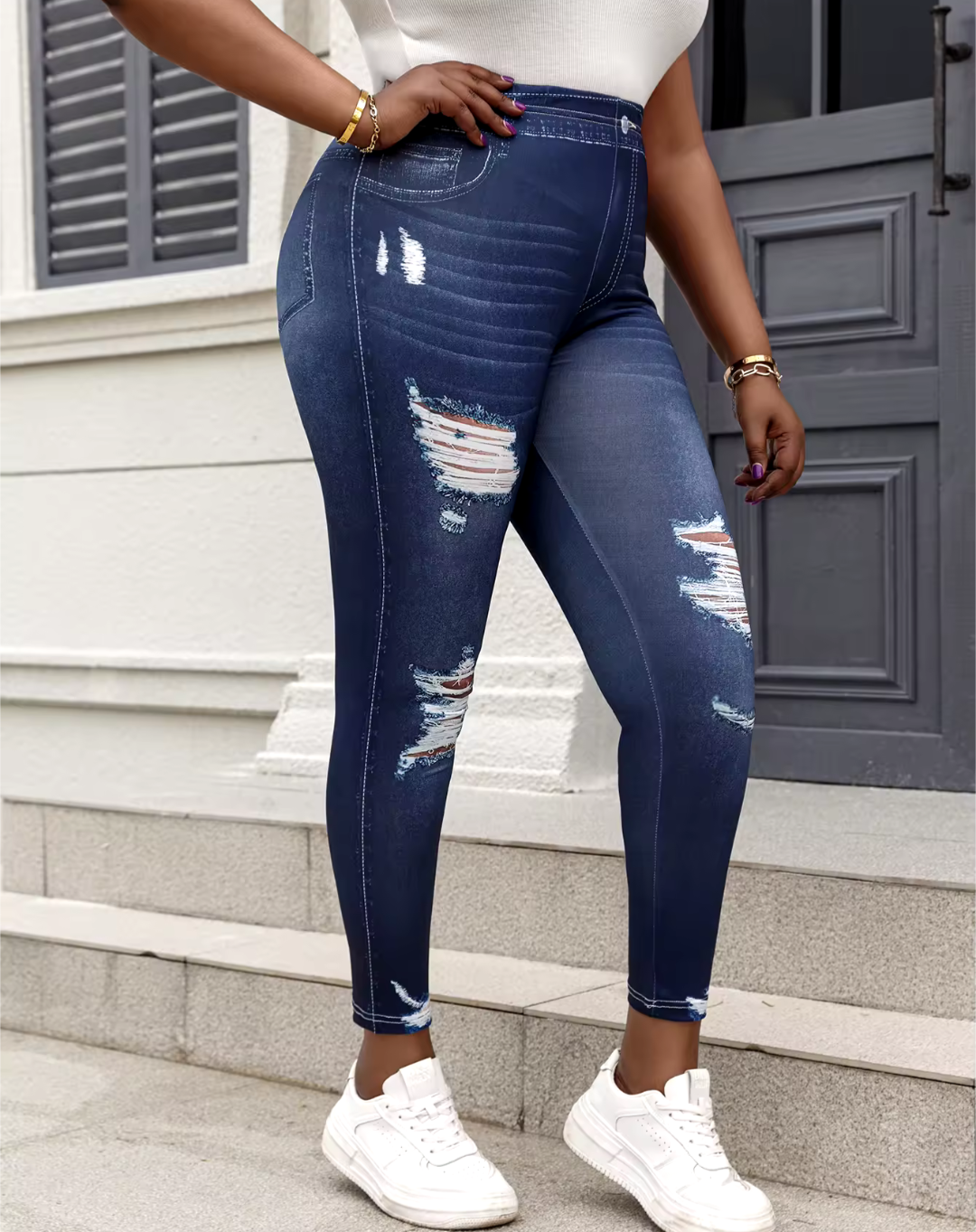 These Plus Size Ripped Immitation Jeans are made with stretchy polyester for comfort and flexibility. The material allows for easy movement and a flattering fit for all body types. Upgrade your wardrobe with these stylish and comfortable jeans.