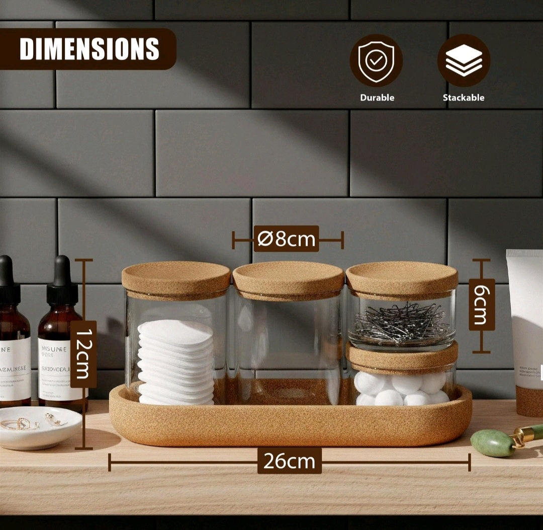Includes 4 containers plus cork tray for stable placement. Durable, lightweight, easy clean build. Thoughtful gift idea for beauty lovers, new homes, or anyone wanting organised cotton pads holder solutions.